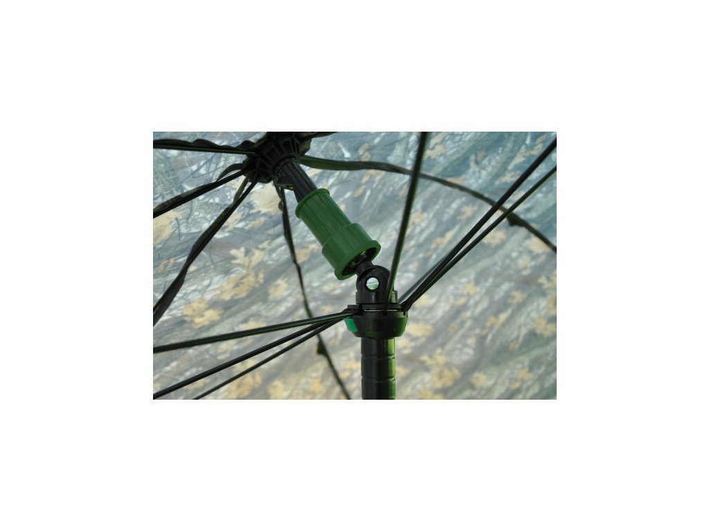 Kvalitný dáždnik s kĺbom a bočnicami. Je vybavený hrubostennou tyčou, odolnou proti deformácii. Poťah je vyrobený z ľahkého, avšak 100% nepriepustného „pogumovaného“ materiálu v zaujímavej maskáčovej úprave s lepenými švami.