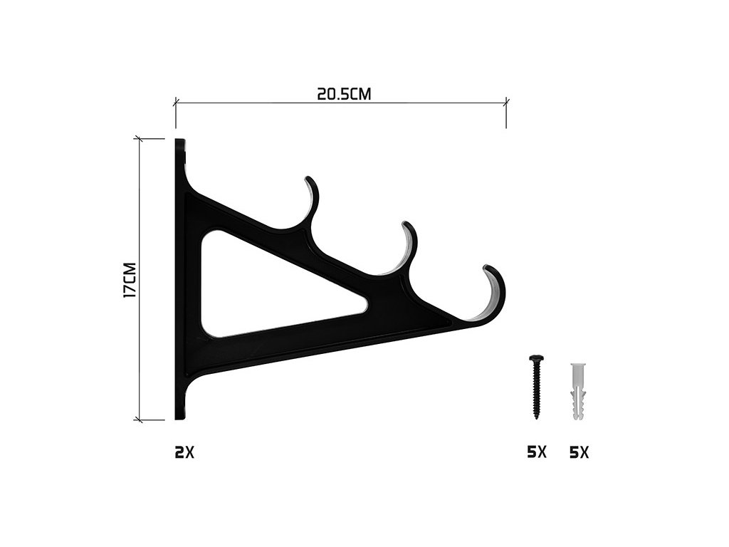 Každý držiak má dva otvory slúžiace na prichytenie ku stene alebo ku kovovému perforovanému držiaku. Súčasťou balenia je 5 kusov hmoždín a skrutiek, takže vám postačuje vŕtačka a skrutkovač a môžete začať s inštaláciou.