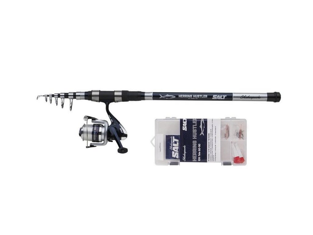 Shakespeare SALT Herring Hustler kombo sú kombá pripravené na rybolov pre rybárov, ktorí by chceli vyskúšať lov rýb bez toho, aby museli priamo míňať veľké množstvo peňazí. Pevný prút zo sklenených vlákien je vybavený očkami z nehrdzavejúcej ocele a vďaka svojmu teleskopickému charakteru sa ľahko skladuje. Silný grafitový navijak je plne navinutý s kvalitným silonom, aby ste si boli istí, že budete môcť vytiahnuť všetky ryby. Aby bolo toto kombo kompletné, pribalili sme kompletný box na náčinie so všetkým koncovým náčiním, ktoré budete potrebovať na chytanie veľa rýb.